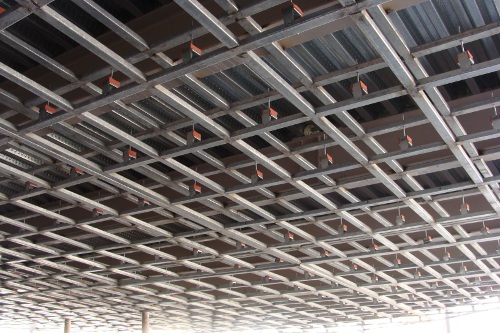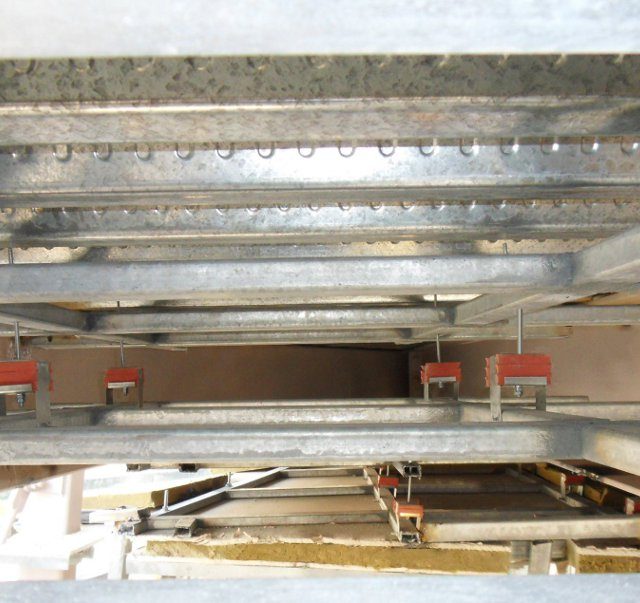 Suspension de faux plafonds insonorisants (plaques de plâtre).