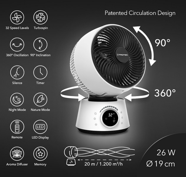 Home TROTEC Ventilation 360° turbo fan TVE 100 3-In-1 circulation fan for air circulation with a scented oil diffuser, patented swivel-tilt function and turbospin technology