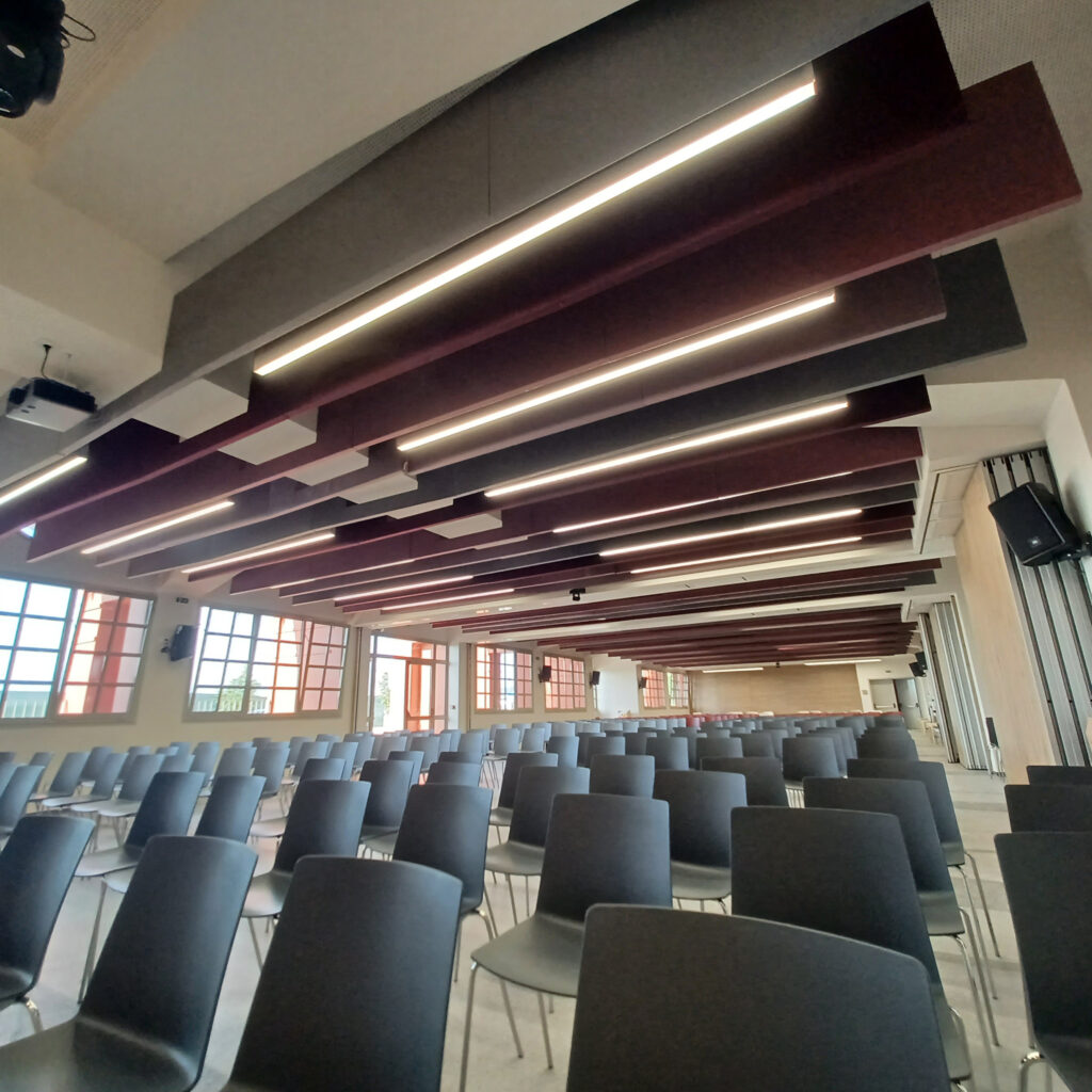 ALPHAcoustic – AB.Tondo are vertical sound-absorbing ceiling baffles with a sophisticated curved design.