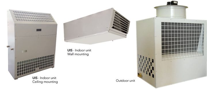 Type of split system air conditioner, air to air cooling, specifically designed and manufactured to operate in an industrialenvironment, in the presence of dust and vibration generally exposed to high temperatures.