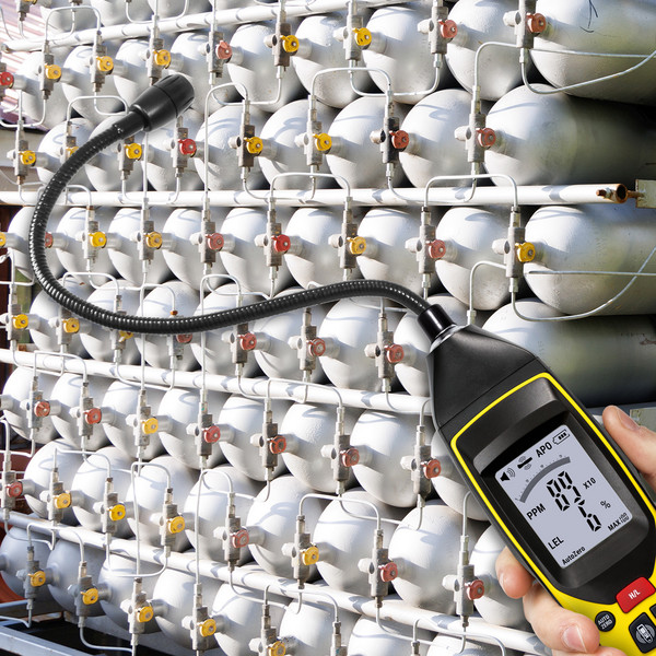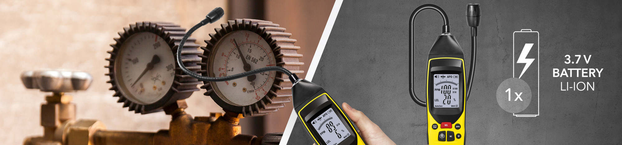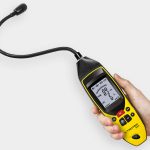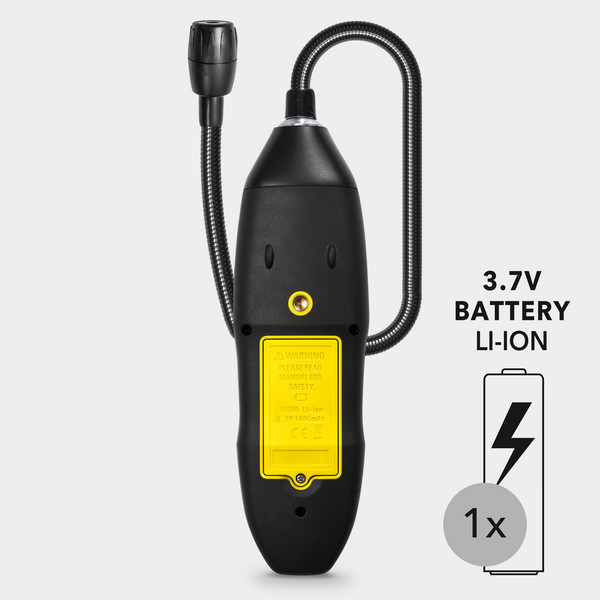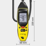 A 40 cm (15.75″) flexible tubing probe allows the detection and identification of a leak in hard-to-reach and constricted areas. The gas detector is equipped with a backlit LCD display, which allows the measured ppm values to be read fast and easily at any time even in unfavorable light conditions. Further, the so-called Lower Explosion Level, abbreviated LEL, which defines the minimum gas concentration in the air at which an explosion is possible, is displayed.