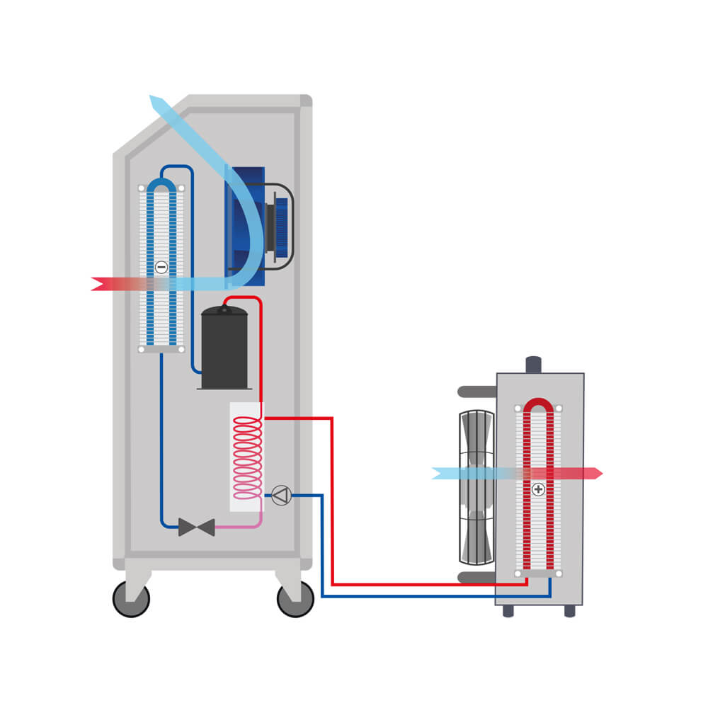 The ACT 7 absorbs the heat into a refrigerant cooling system. From there, the heat is transferred to the self-containing chilled water/glycol system. It is then pumped through to the outdoor unit where the water is cooled and the heat dissipates.