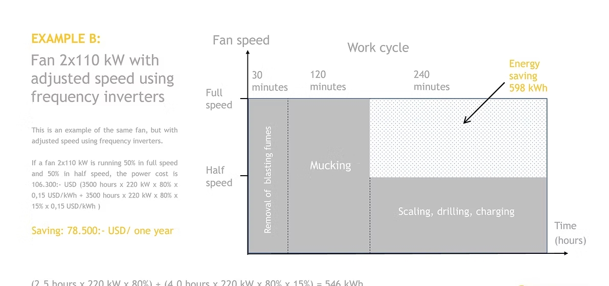 After the blasting fumes are out, the mucking commences and also during this event, the fan is run in full speed since normally, a large amount of diesel fumes from trucks and loaders is polluting the air. (this normally takes 90-150 minutes) After the mucking is completed the scaling, drilling and charging takes place and for these works, the fan speed is reduced to half speed. These works totally takes 180-240 minutes.