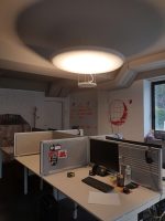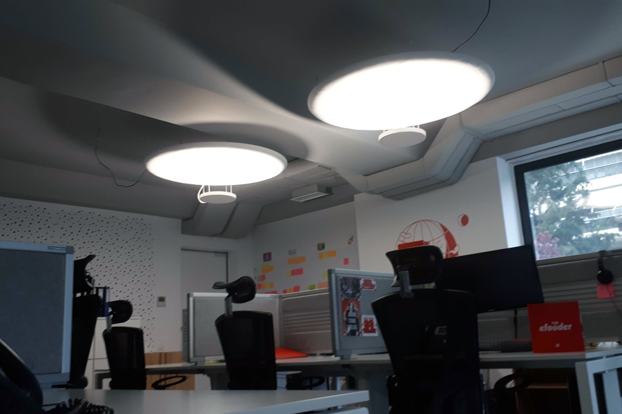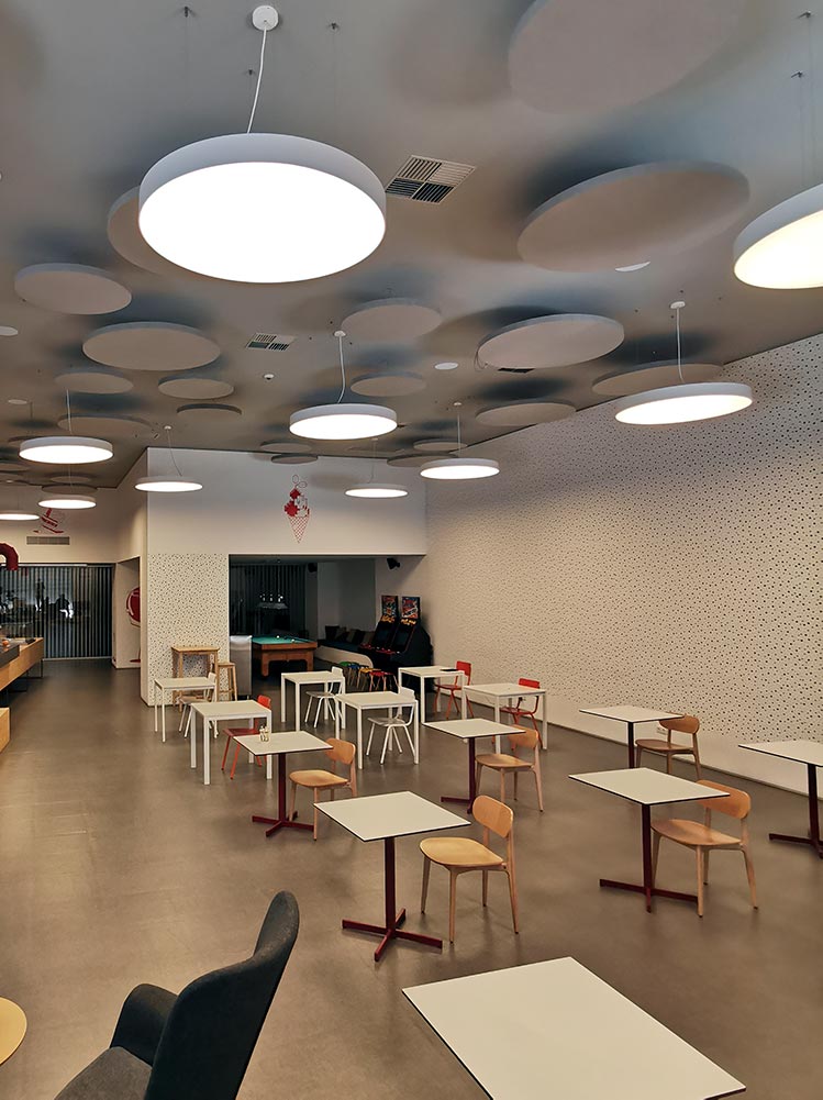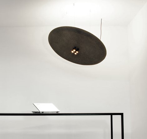ALPHAcoustic – Kiklos.Fos is a new series of round acoustic panels that combine acoustics with LED lighting. Named after the Greek word “ΦΩΣ” which means light, these acoustic panels are hung horizontally from the ceiling and wrapped with acoustically transparent fabric. They include a round lighting system that allows direct and reflected lighting. Besides excellent acoustics, they are designed with the aim of providing interior architects and mechanical lighting consultants complete acoustic and lighting solutions.