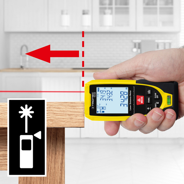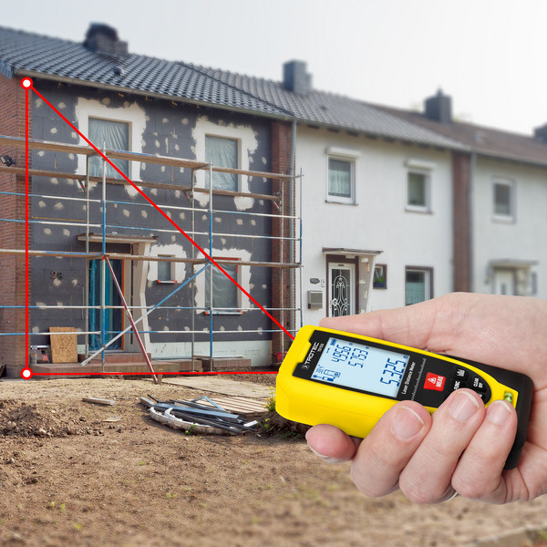 In addition to distance measurement, the TD120 also calculates areas or volumes and has integrated functions for 2-point and 3-point Pythagoras measurements, for example for indirect height measurements or partial distance calculations.