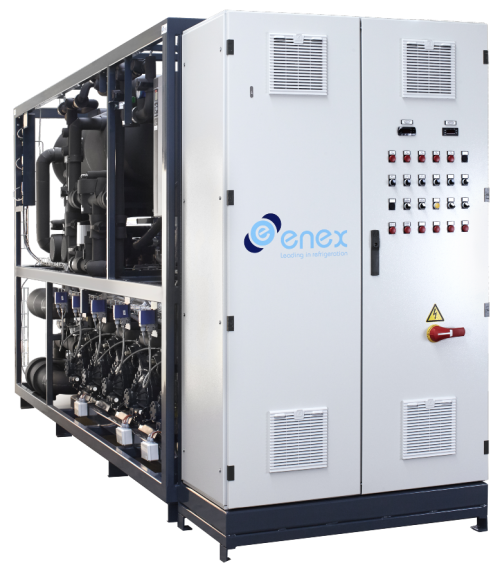 Yukon is Enex’s innovative range of air-cooled and water-cooled CO₂ transcritical chillers for the cooling of water and brine mixtures, suitable for such applications as process cooling, cold storage, HVAC, ice rinks, wineries, and more. It offers a split configuration with remote gas cooler, ideal for installations where the compressor section must be located in a plant room for noise reduction and easier maintenance. The Yukon unit has one option for heat recovery, which allows it to produce hot water up to 80°C. To produce chilled water and brine, the Yukon unit multi-compressor version features a gravity flooded evaporator system, which ensures simplicity of design, high efficiency, stable control and extreme reliability. It is a unique design particularly suitable for CO₂ refrigerant. For some comfort and brine models, the patented Enex ejector option is also available, which further increases efficiency.
